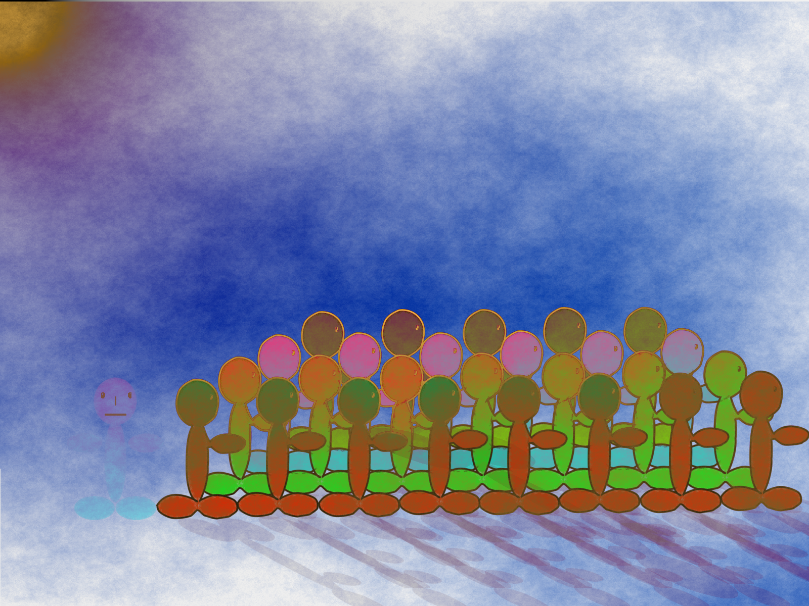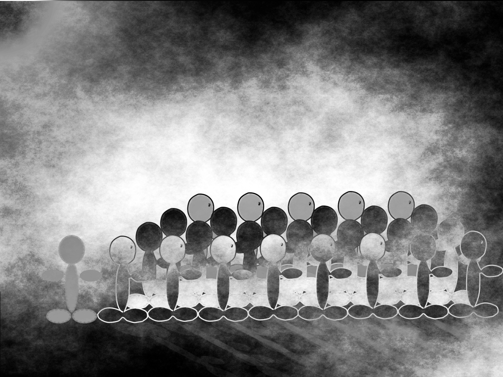 Πρώτα δείτε την ασπρόμαυρη. Σκεφτείτε τον εαυτό σας σαν το ανθρωπάκι αριστερά. Ένα γκρίζο που δεν είναι ούτε μαύρο, ούτε άσπρο και ούτε καν πρόσωπο δε φαίνεται να έχει. Τι ασήμαντο ανθρωπάκι! Τα άλλα πάνε όλα μαζί και έχουν το δρόμο τους. Αυτό τι κάνει μόνο του; Είναι και αυτός ο ασπρόμαυρος καπνός... Με το ζόρι φαίνεται.